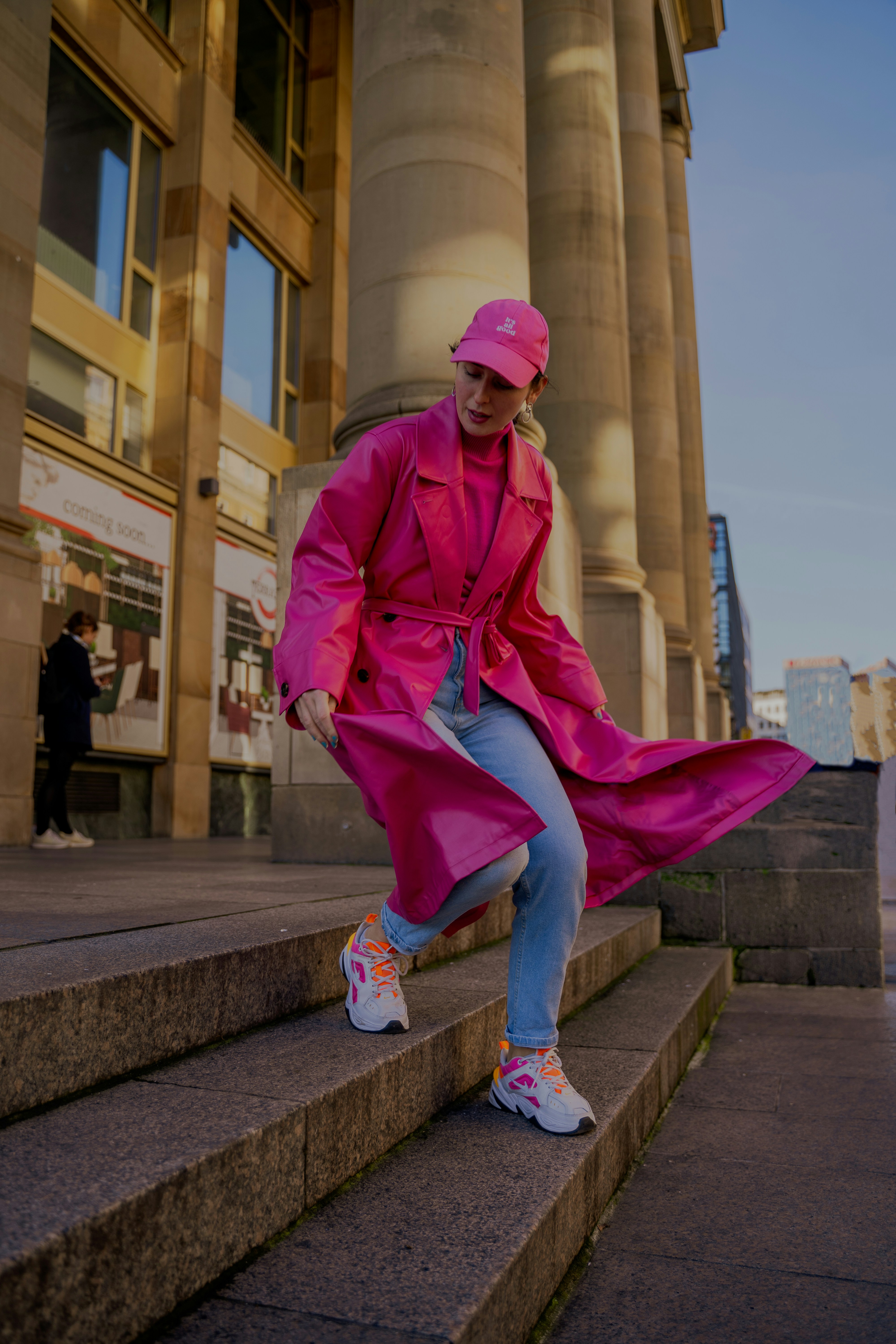 Look 2 Um look estiloso com trench coat, jeans e tênis de corrida.